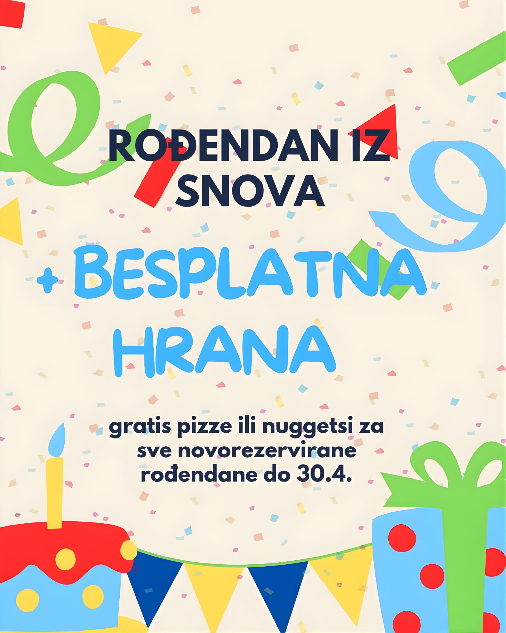 Svi rođendani rezervirani do 30. travnja uključuju BESPLATNU hranu za sudionike proslave. Time se organizacija pojednostavljuje, a slavlje dobiva dodatnu notu bezbrižnosti i užitka.
