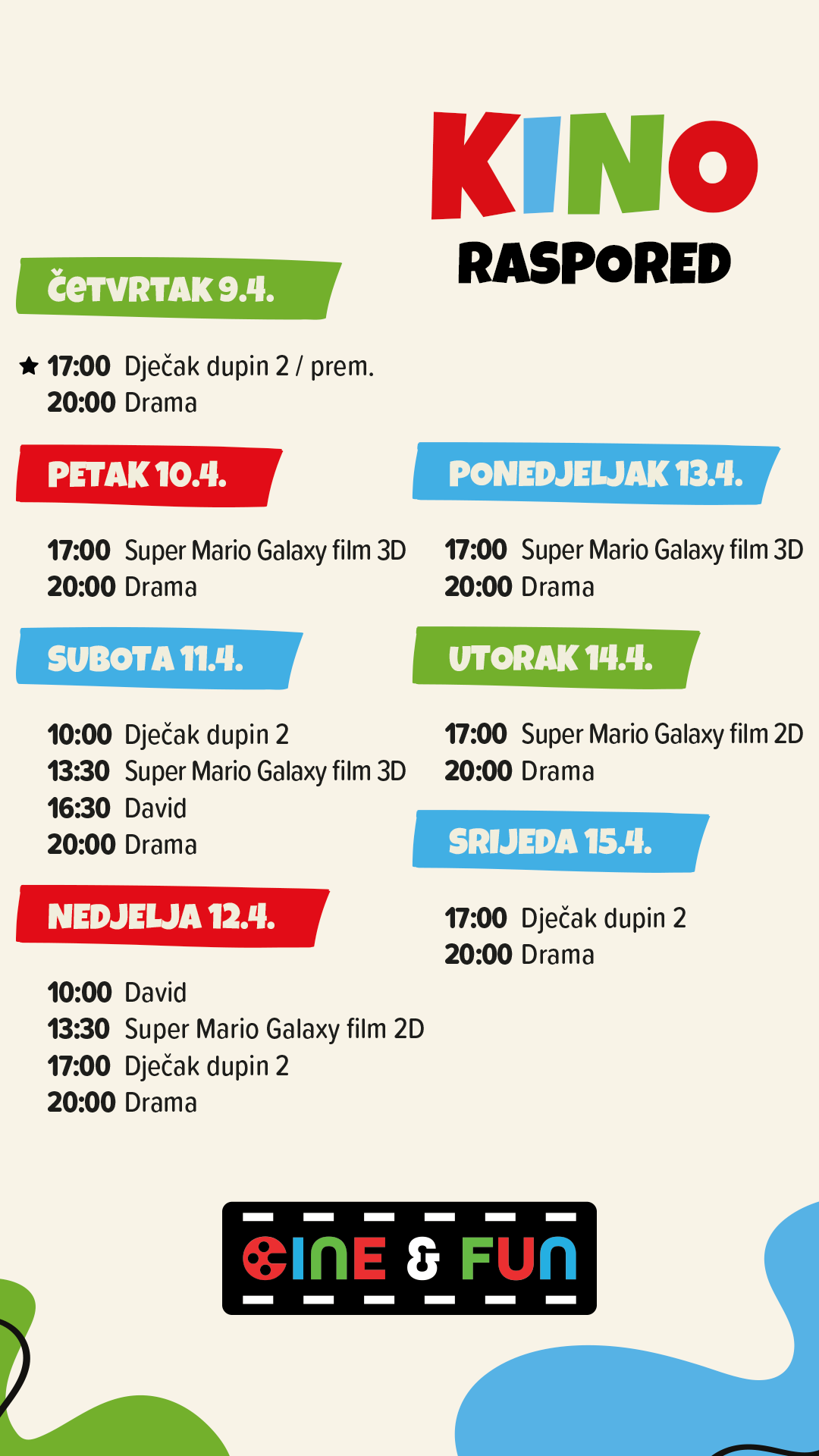 🐬 DJEČAK DUPIN 2 (premijera 9.4. u 17:00) – Animirani hit se vraća! Mladi Dupinko i njegova morska družina kreću u najveću avanturu dosad! Poruka u plutajućoj boci otkriva lokaciju tajanstvenog napitka, a divlji kit prijeti njihovim prijateljima. Dupinko mora spasiti svoje suputnike, ali i pronaći tragove svojih roditelja i otkriti svoje pravo ljudsko ime! Magična priča o prijateljstvu, hrabrosti i ljubavi prema moru. Redatelj Mohammad Kheirandish. Sinkronizirano na hrvatski (glasovi: Franko Aničić, Karlo Mrkša, Bojan Jambrošić). Prvi je film bio hit u 30+ zemalja! 96 min.